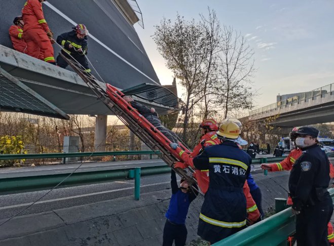 黄石市消防救援指挥中心于15时42分接到报警,随后马上启动应急响应,4个消防救援站、12台消防车、80名指战员迅速集结,然后急忙赶往现场,15时55分,当第一批救援力量到达时,所见到的是3辆侧翻货车以及1辆被埋压的小车。