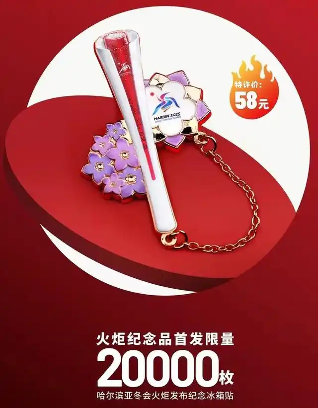 本轮爆款是哈尔滨亚冬会火炬发布纪念冰箱贴,它运用微缩工艺,高度还原了火炬的每一处细节,其设计巧妙融入了亚冬会会徽以及哈尔滨市花丁香花,由精致的O字链连接起这些元素,使得小小冰箱贴既有收藏价值,又带着城市韵味。