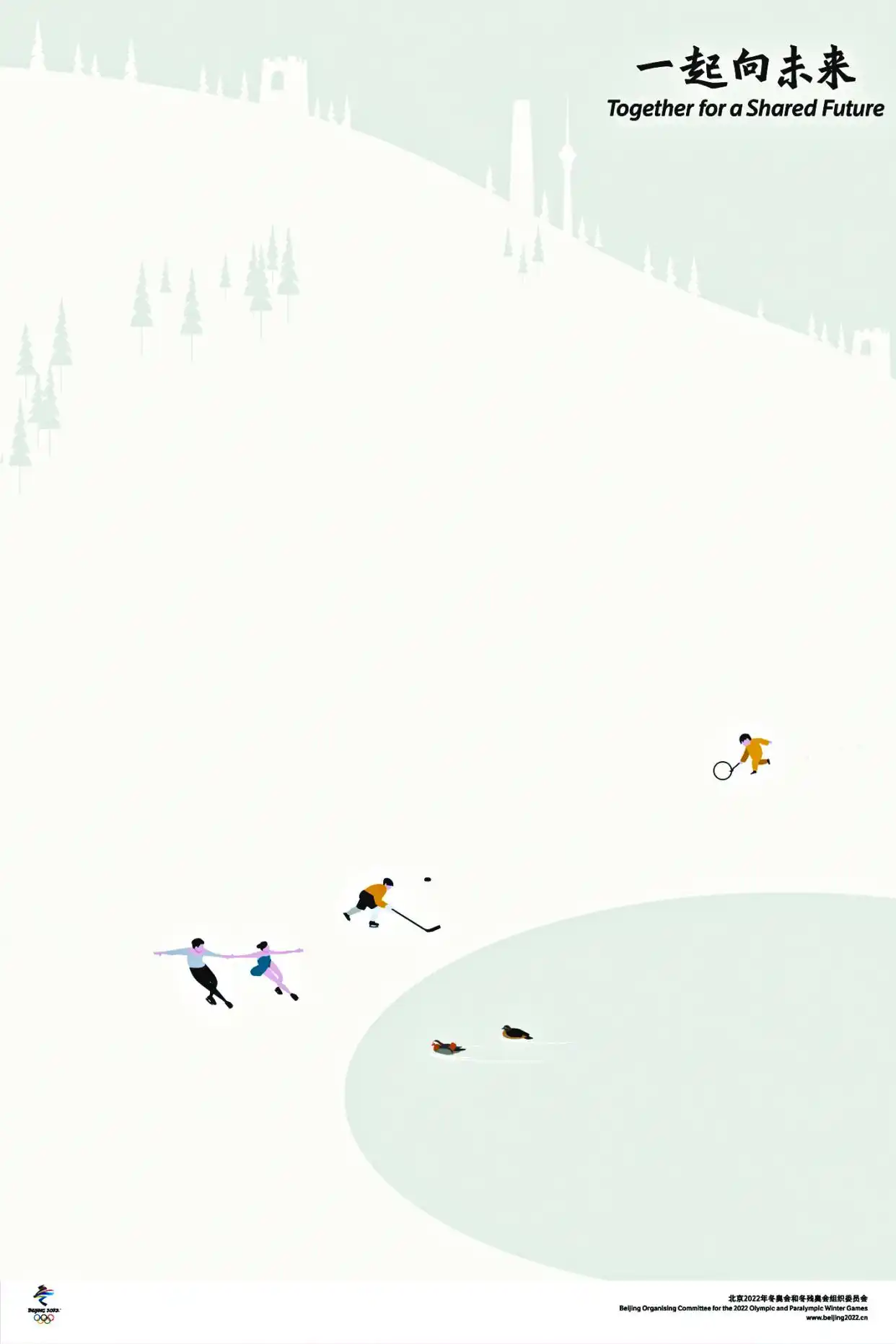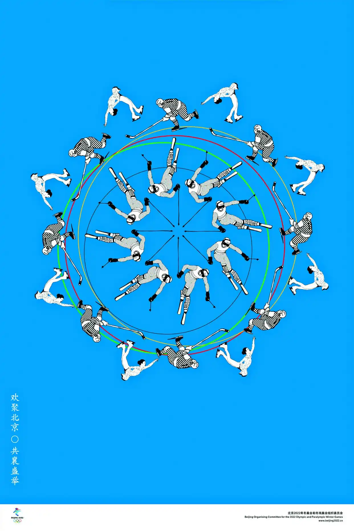 灵感源于 Beijing 民间冬季运动场景的《大家的奥运会》,是视觉中国设计总监颜冬创作的。他发现后海冰面上有市民滑冰车的场景,这场景与现代冬奥项目,既有相似的地方,又存在完全不同之处。