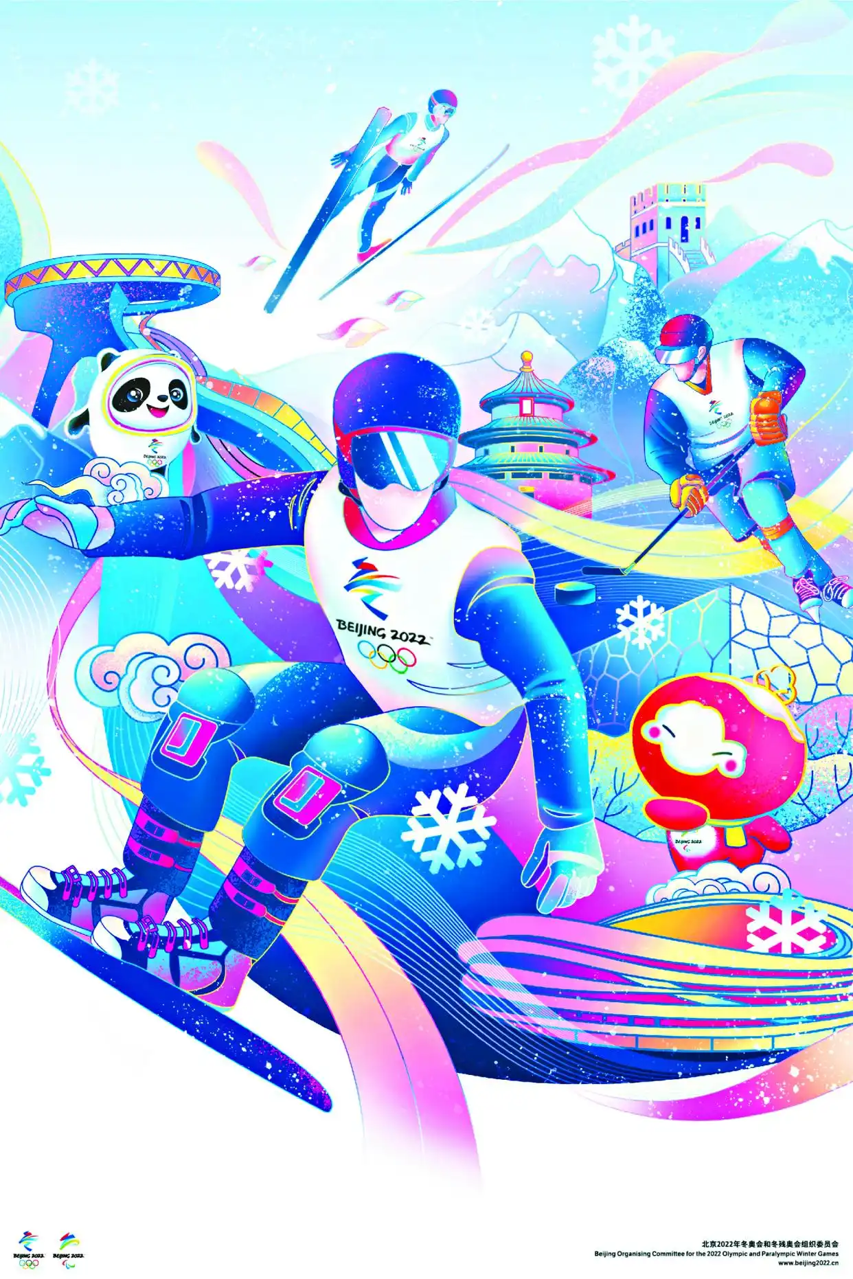 长城以及天坛这类标志性建筑于丝带相互交错之际隐隐约约地显现出来,冰墩墩与雪容融灵动活泼地与主体运动人物相互呼应着,整个画面洋溢着律动感,这样的表现手法突显了新时代青年对于文化的认同,呈现出中国冰雪文化的当代魅力。