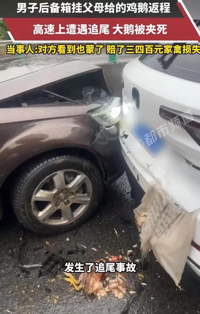 2026年2月24日那天,在湖南永州的高速上,发生了一起特别离奇的车祸,来自湖北的胡先生,将父母给他的活鸡活鹅挂在了后备箱外用来透气,结果被追尾后,那些家禽当场就死亡了,他拿了对方给的三四百元赔偿,之后又把死鸡死鹅捡回去吃了,这件事情传到了网上以后,网友们就为“赔了钱,死鸡归谁”这一问题吵得不可开交。